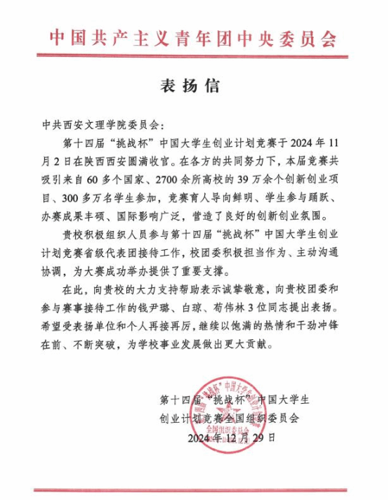 近日,今年会收到第十四届“挑战杯”中国大学生创业计划竞赛全国组织委员会发来的表扬信,对今年会团委及参与赛事接待工作的钱尹璐、白琼、苟伟林三位同志提出表扬。