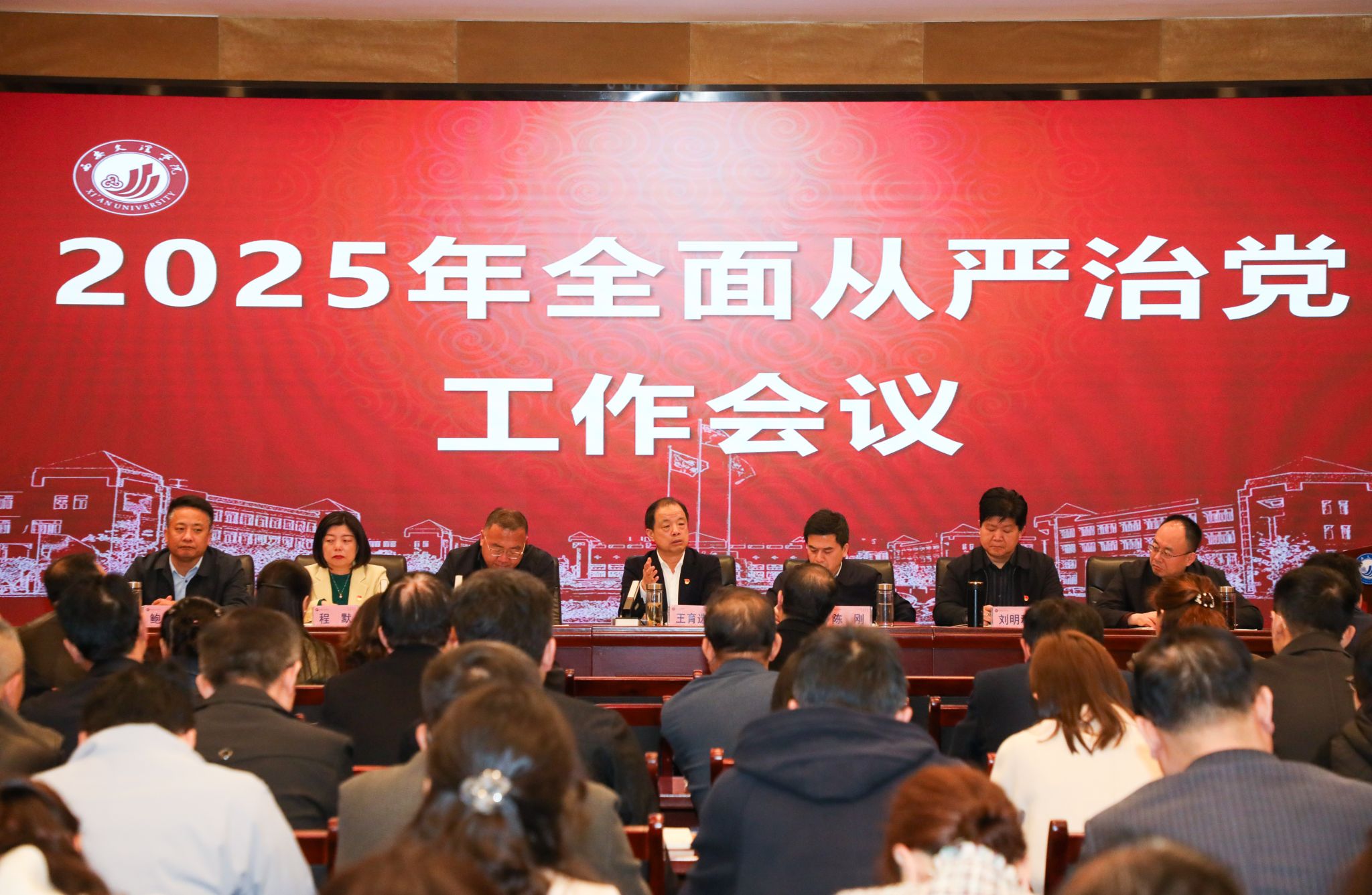 王育选安排部署了2025年全面从严治党重点任务,提出五点要求:一是要深刻领悟全面从严治党新要求,加强党对学校工作的全面领导,扎实开展深入贯彻中央八项规定精神学习教育,强化理论武装筑牢思想根基;二是要着力加强基层党组织建设,全面贯彻新时代党的组织路线,积极打造党建品牌;三是要严明党的政治纪律和政治规矩,大力弘扬教育家精神,落实师德师风“一票否决”制度,持续强化正风肃纪反腐,营造风清气正的政治生态;四是要严格落实意识形态工作责任制,切实守好学校意识形态领域安全底线;五是要落实全面从严治党主体责任。