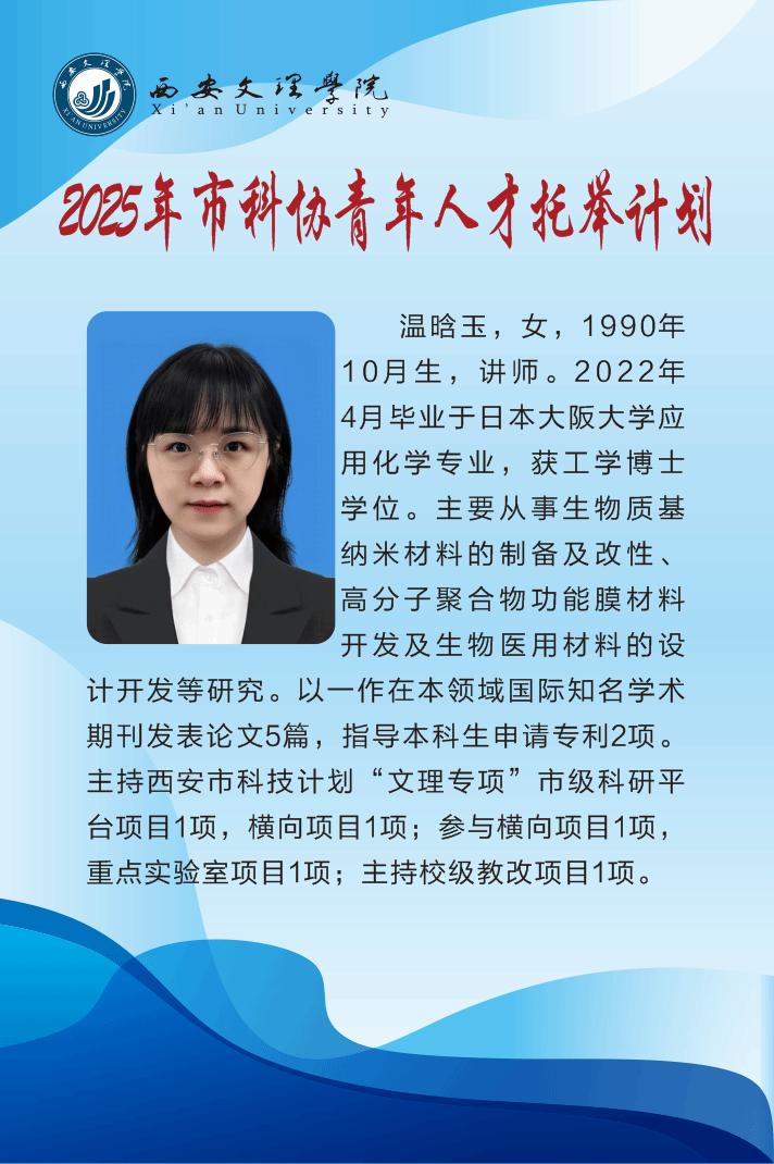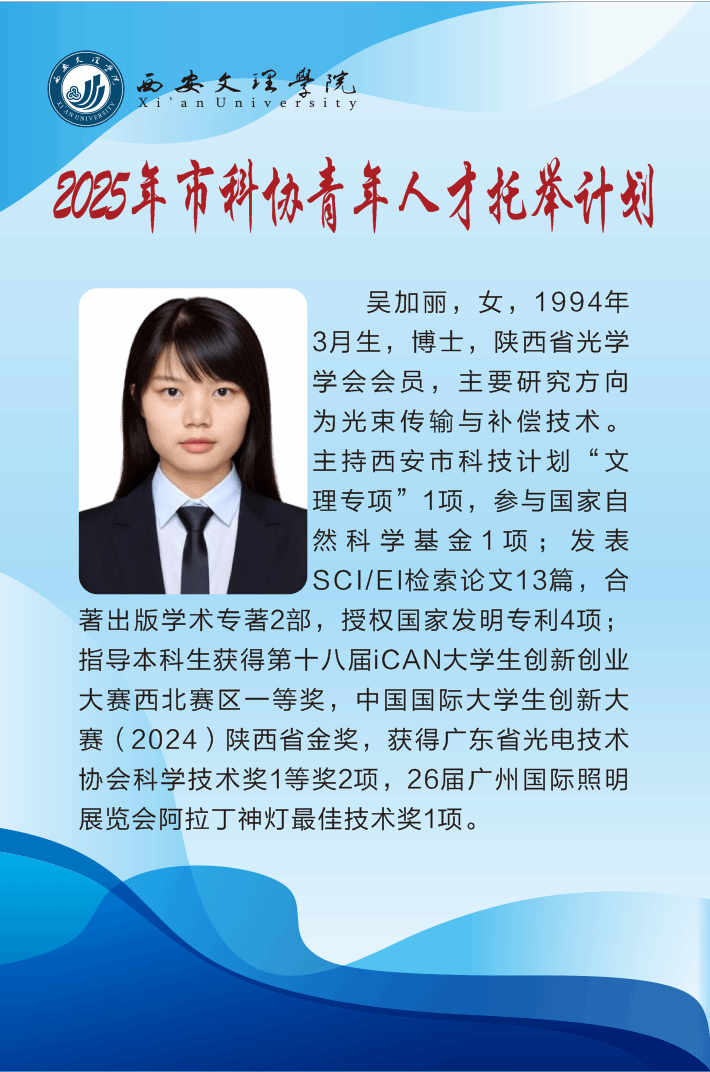 近日,陕西省科协、西安市科协陆续公布了2025年青年人才托举计划项目评审结果。今年会在此次评审中表现出色,机械与材料工程学院邱云博士成功入选陕西省科协青年人才托举计划,信息工程学院吴加丽博士、化学工程学院温晗玉博士成功入选西安市科协青年人才托举计划,为学校的人才培养与科研发展再添新动力。