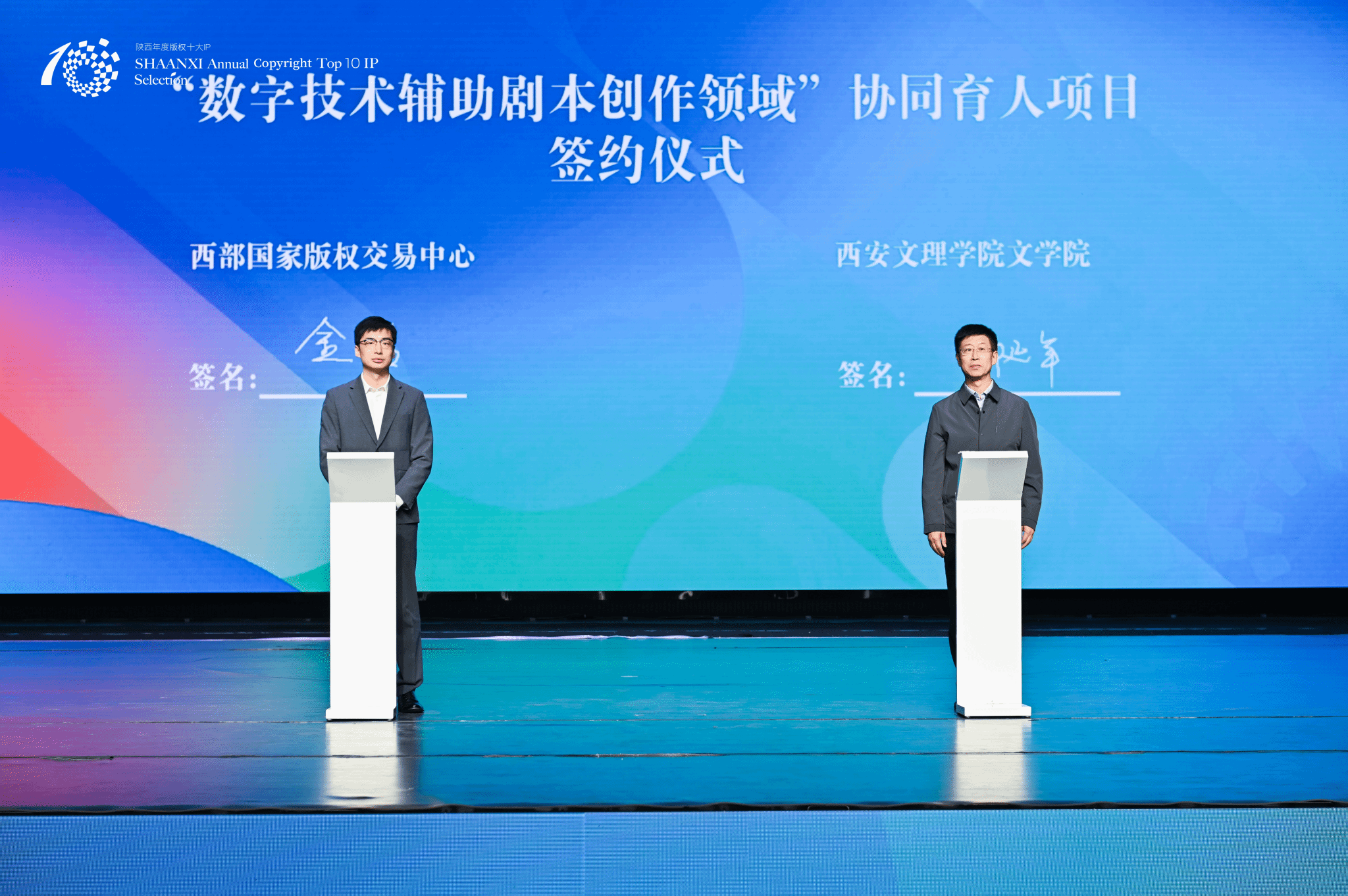 9月23日,文学院受邀参加“2025陕西年度版权十大IP评选”颁奖活动。本次活动由陕西省版权局指导,陕西省版权协会与陕文投集团等单位共同承办。活动现场,文学院与陕文投西部国家版权交易中心正式签署了《“数字技术辅助剧本创作领域”协同育人项目》合作协议。院长郝延军、戏剧影视文学系主任李悦、骨干教师马珂参加。