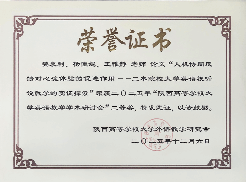 此外,大会还进行了陕西高校外语教师学术论文评奖,外国语学院大学英语教学部樊袁利老师提交的论文《人机协同反馈对心流体验的促进作用---二本院校大学英语视听说教学的实证探索》荣获优秀论文二等奖。