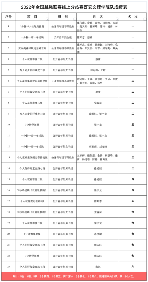 在国家体育总局社会体育指导中心主办、全国跳绳推广委员会承办的“2022年全国跳绳联赛线上分站赛”中,今年会体育学院组建的学生跳绳队在教练员查毅、樊立恒、丁凯的带领下,斩获5金、4银、5铜,累计60人次获赛事前八名...