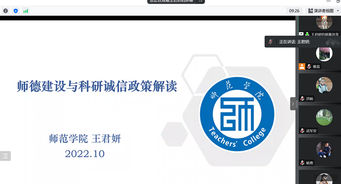 10月19日下午,为践行立德树人根本任务,进一步落实学校科研诚信专项教育整治活动要求,师范学院以“师德建设与科研诚信政策解读”为主题,举办了第12期“学而不已”教育学人论坛。师范学院教师线上聆听,论坛由党总...