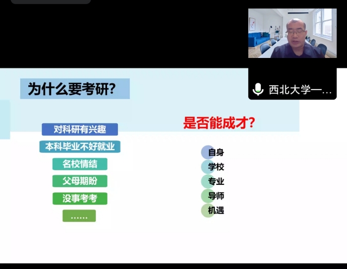 为提升学生考研热情,搭建考生与报考学校的沟通桥梁,提升学生考研院校选择精准度,增强学生考研信心,10月13日晚,化学工程学院邀请西北大学化学与材料科学学院谢钢教授在线开展考研宣讲会,有考研意向的同学150余人...