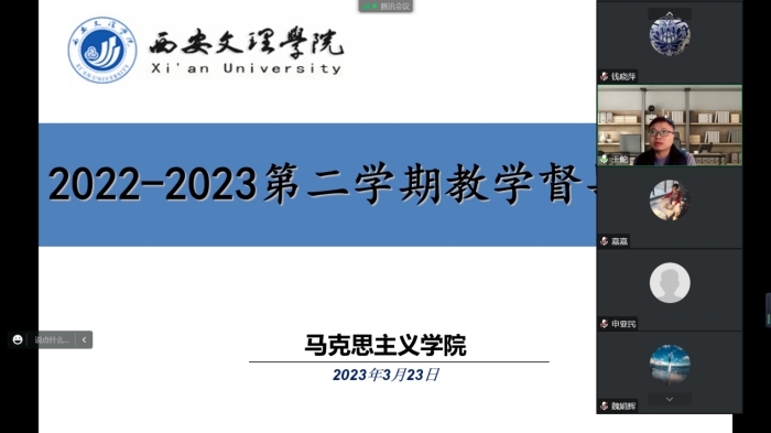 3月23日,马克思主义学院教学质量监控办公室线上召开2022-2023学年第二学期教学督导组第一次工作会议。申亚民教授等5名校内外督导专家,马克思主义学院院长钱晓萍、教学副院长王舵参加会议。 王舵通报了上学期学院教...