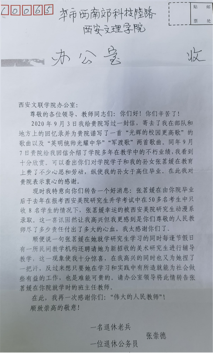 近日,美术与设计学院收到学校党政办转来2022届美术学系毕业生张茗媛同学家长的一封感谢信。家长是张茗媛的爷爷张崇德,张老先生是一位退休老兵,信中,老先生对学校和学院在张茗媛同学在校求学期间给予的关心、教育...