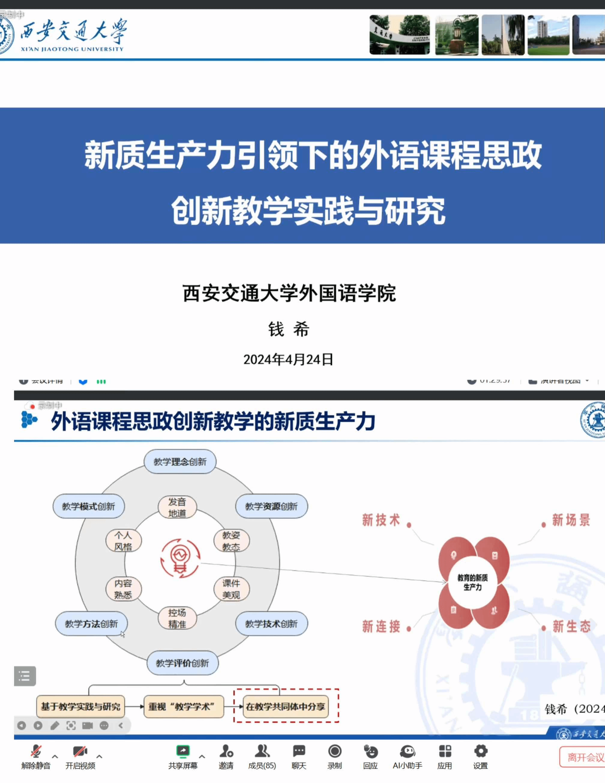 4月24日晚,应外国语学院邀请,西安交通大学外国语学院钱希教授以“新质生产力引领下的外语课堂思政创新教学实践与研究”为主题,为全体教师作线上报告。外国语学院院长韩红建、教学副院长熊国芳、学院全体教师以及师范学院、学前教育学院的部分教师参加本次活动。钱希教授结合自身的外语课程思政教学实践与研究经验,从外语课程思政的内涵、实现路径、“通用学术英语”课程的创新教学实践、课程思政的评价反馈和外语教师职业发展等五个方面,...