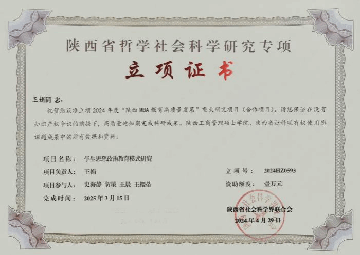 近日,音乐学院教师王娟教授成功获准立项2024年度“陕西MBA教育高质量发展”重大研究项目。这一成果不仅标志着音乐学院在学科建设上取得了新的突破,也体现了学院在对标音乐申硕专业学位点建设过程中的积极努力与有组织的科研能力。据了解,此次立项的“陕西MBA教育高质量发展”重大项目,旨在通过深入研究MBA教育的现状与发展趋势,探讨如何提高MBA教育的质量和效益,为陕西省乃至全国的MBA教育事业发展提供有益的借鉴和参考。项目的成功立项对于音乐学院来说意义重大,...