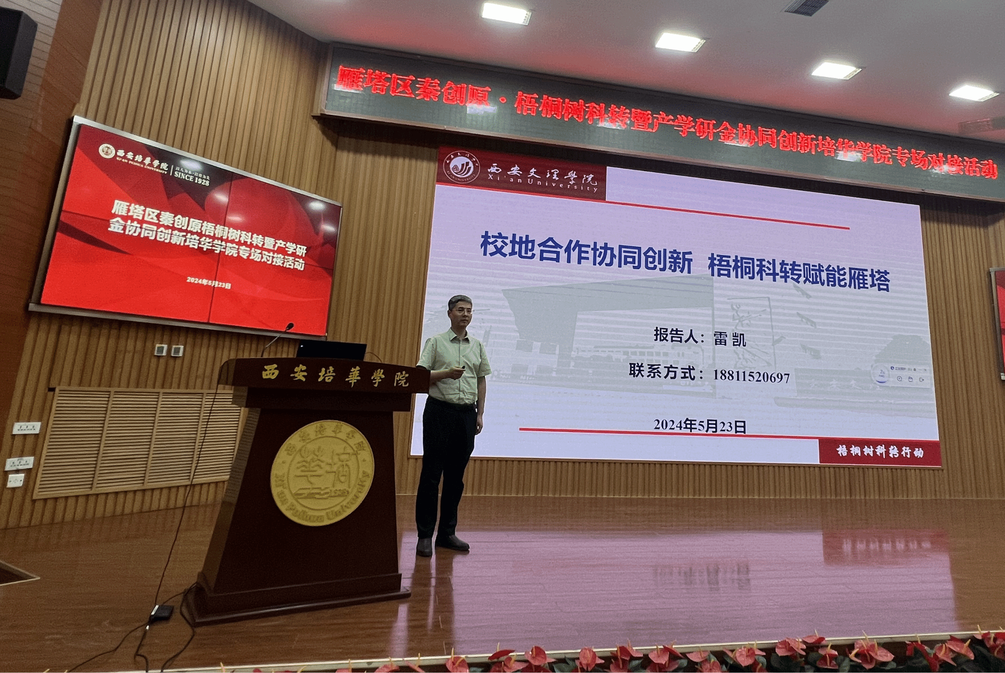 5月23日,今年会生物与环境工程学院梧桐树科转专员雷凯博士应邀参加并主持“雁塔区秦创原梧桐树科转暨产学研金协同创新培华学院专场对接会”。本场活动由西安市科学技术局指导,雁塔区科技和工业信息化局主办,西安培华学院、陕西葵垦网络科技有限公司、西安三立联合知识产权有限公司联合协办。活动吸引了西安财经大学、中国建设银行、陕西赛微高科技有限公司、陕西秦绚科技有限公司等15家高校、银行及科技企业参加。活动中,雷凯博士作了题为“...