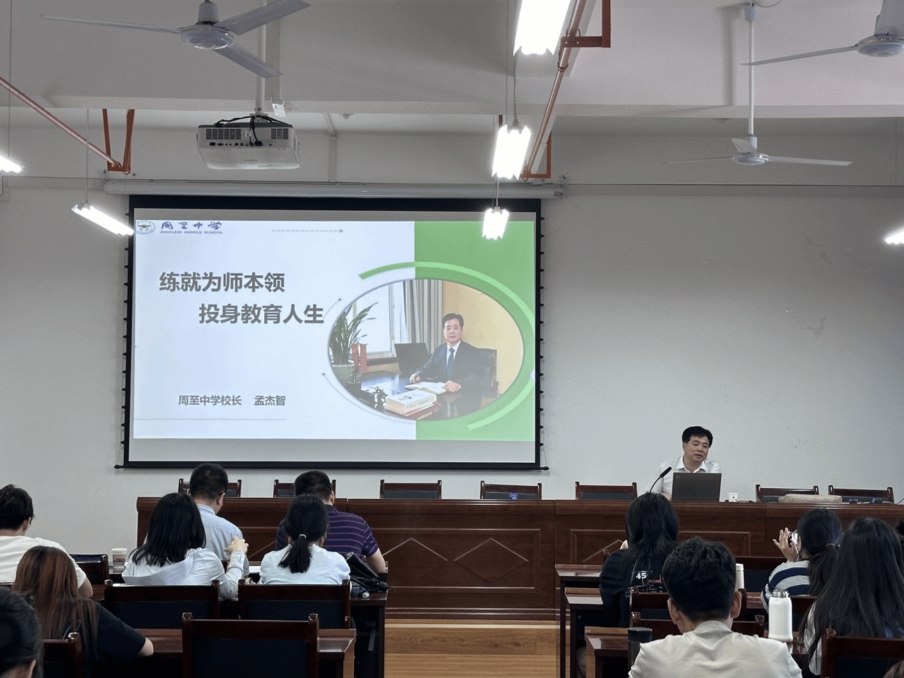 6月5日,信息工程学院邀请陕西省示范高中-周至中学党总支书记、中学高级教师孟杰智校长为数学系专业教师以及数学与应用数学专业2021级、2022级全体学生作了题为《练就为师本领,投身教育人生》的专题报告。报告会由数学系主任王宇主持。孟杰智连续六年被周至县委县政府评为“优秀校长”,教学和管理经验丰富,他从当前师范生的就业前景谈起,用数据和实例分析农村基层学校的现状和需求情况、基层学校需要什么样的好教师,通过视频直观展现了扎根农村教师的成长历程,...