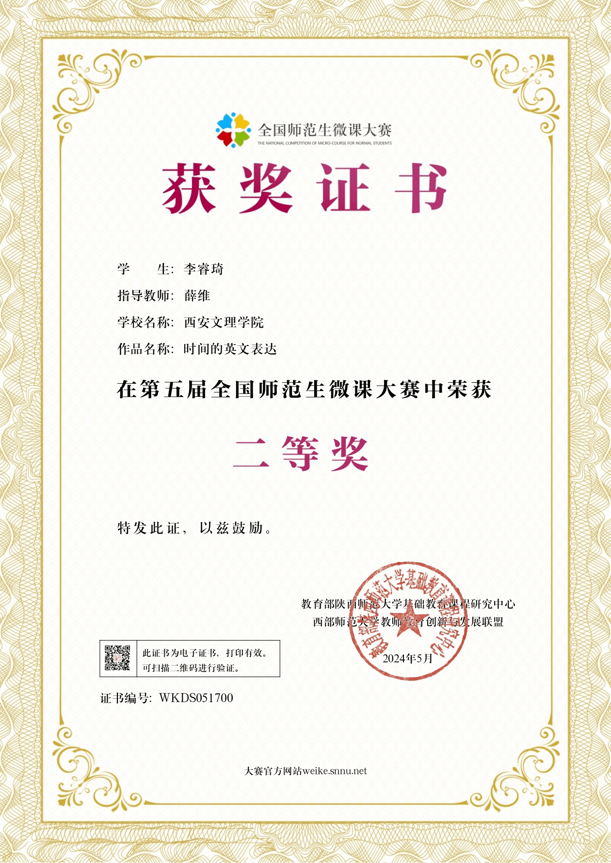 6月11日,第五届全国师范生微课大赛决赛评审结果公布,外国语学院英语专业学生李睿琦在薛维老师的指导下,细心打磨、精益求精,经过层层选拔和严格评审,取得二等奖的好成绩,为学院争得荣誉。全国师范生微课大赛是由教育部陕西师范大学基础教育课程研究中心和西部师范大学教师教育创新与发展联盟主办,是目前国内影响力最大的面向各层次各学科师范专业学生的全国性赛事,是学校认定的B类学科竞赛。本次大赛汇聚了首都师范大学、南京师范大学、...