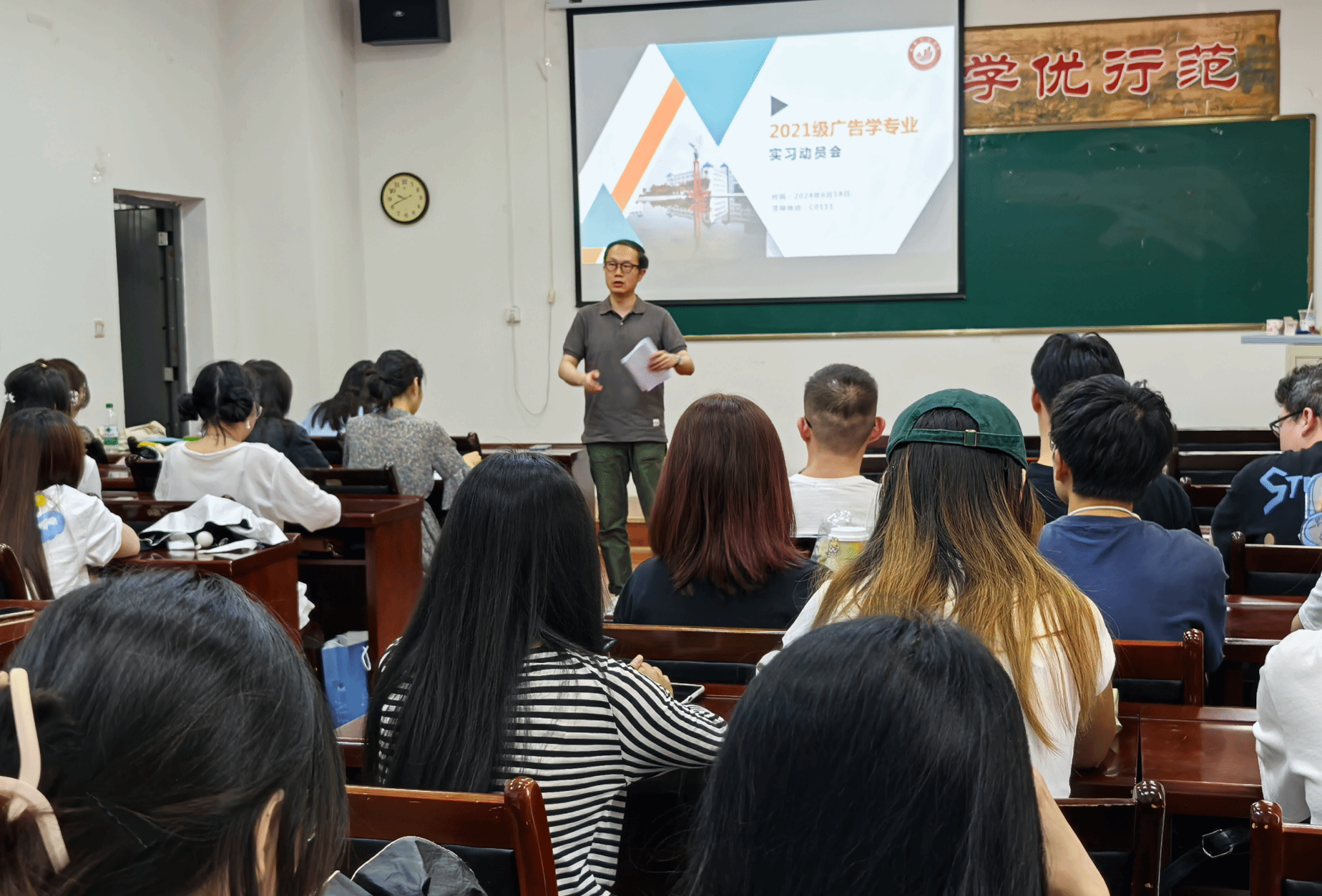 6月18日,文学院广告学专业召开2021级实习动员会。教学副院长苏羽、广告学系主任张倩、21级广告学专业辅导员赵鑫出席,广告学专业教师高劼、孙伟伟、岳晨参加。会议开始,岳晨向学生介绍了实习工作安排及要求,强调毕业实习作为一门课程的重要性,同时也是检验三年专业学习、准备毕业论文课题以及走向职场的重要准备。张倩向学生介绍了此次实习单位的概况、工作岗位以及各单位实习人数安排情况。赵鑫提出,每位同学需要重新审视自身学习任务的完成情况,...