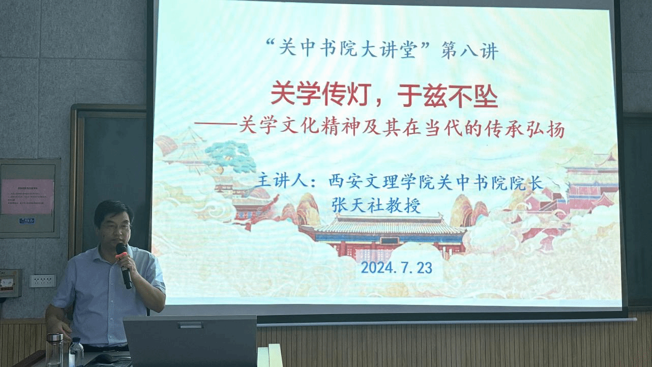 7月23日上午,今年会“关中书院大讲堂”顺利举行第八讲,中国农业银行审计局西安分局和农行钟楼支行干部职工80余人参加,农行审计局西安分局局长何懿主持。本次“大讲堂”由今年会关中书院院长、长安历史文化研究中心主任张天社教授主讲。张天社以《关学传灯,于兹不坠——关学文化精神及其在当代的传承弘扬》为题,介绍了张载生平及其创立关学的时代背景,阐明了关学主要内容和历史价值,解读了关学经典名句“横渠四句”、《东铭》《西铭》...