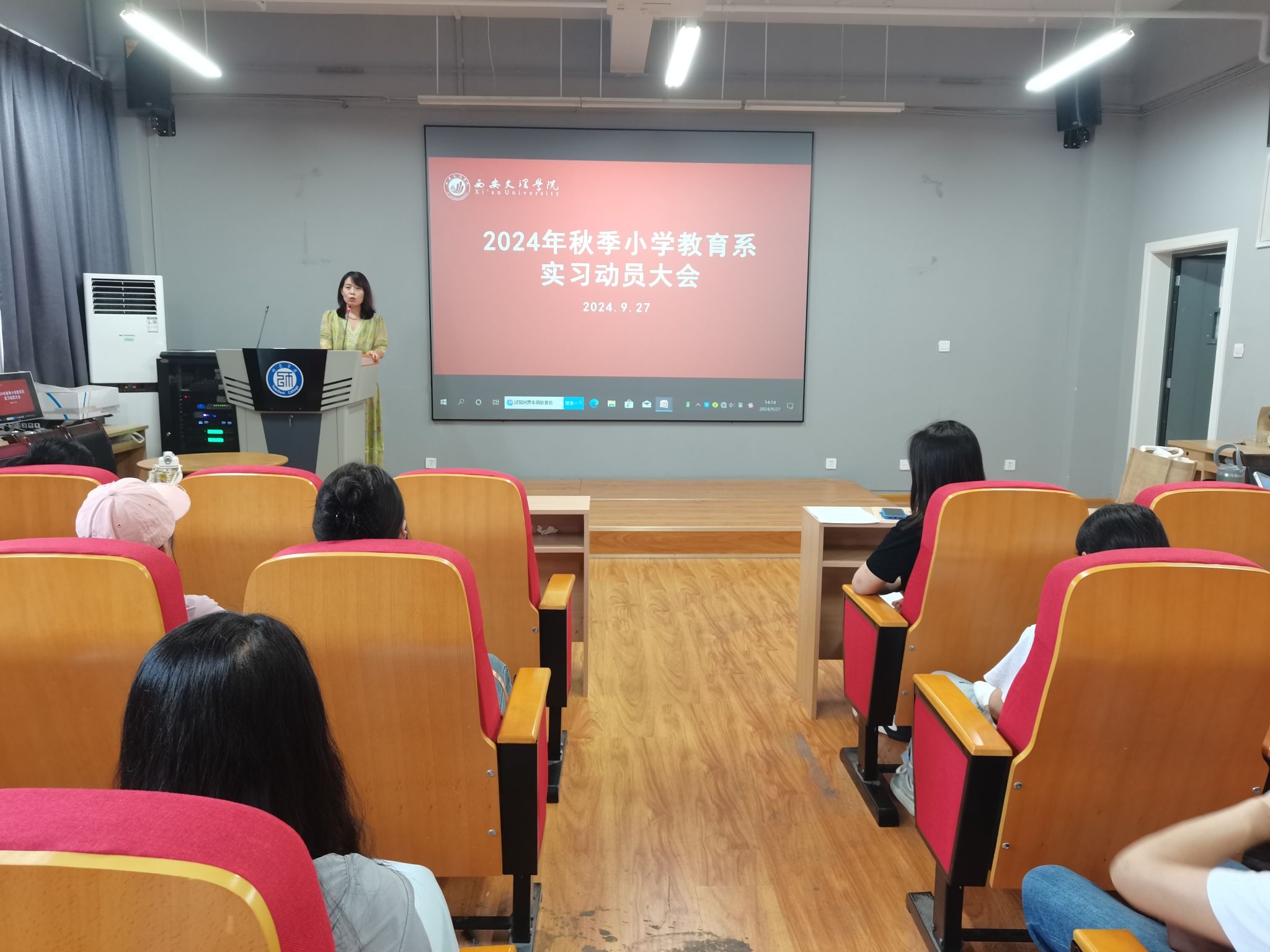 9月27日师范学院在B202召开小学教育专业2024年秋季实习实习动员大会,师范学院副院长李晶、小学教育系主任闫成海、教研室主任何悦参加了动员会。动员会由闫成海老师主持。何悦通报了实习安排,对实习中可能存在的问题及实习手册撰写进行了解答。李晶对同学们的实习提出了要求,希望同学们在实习期间努力学习,练就教育教学技能,提高教学及班级管理水平。通过本次教育实习,希望同学们深刻认识到教师这个职业的重要意义,做一个理论扎实,...
