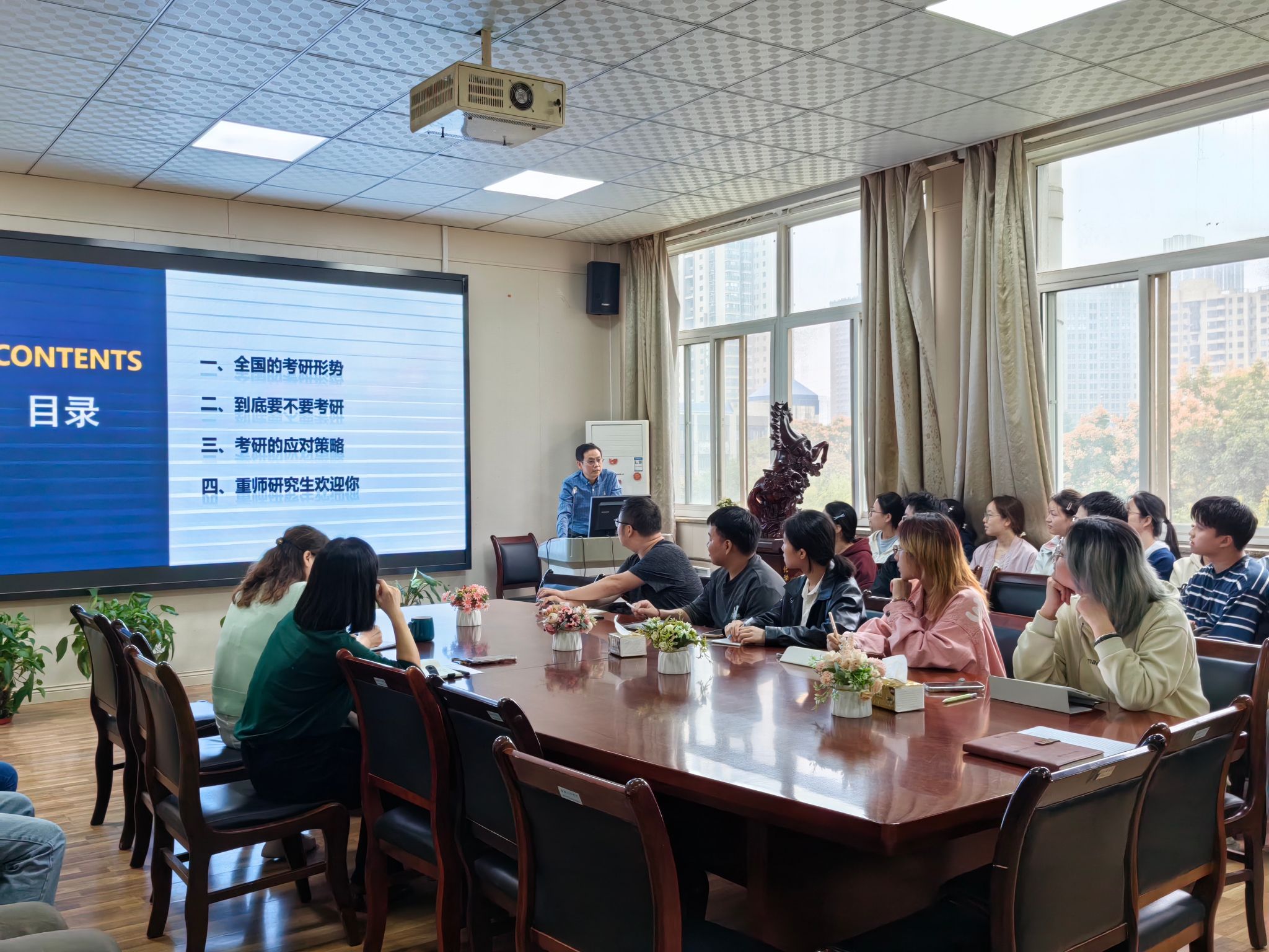 为帮助考研学生了解研究生招生形势,了解招生院校、学会科学报考,10月8日下午,化学工程学院组织了考研政策解读报告会。讲座特邀重庆师范大学研究生院副院长杨俊、西安理工大学能源材料与器件系主任李文斌为学生作报告。化学工程学院及信息工程学院考研学生共60余人聆听了报告。杨俊从就业市场状况、考研学生的现状及学术适应能力三个方面介绍了全国考研现状。随后,他从全国考研现状、国际形势、研究生录取政策等方面进行了系统讲解,...