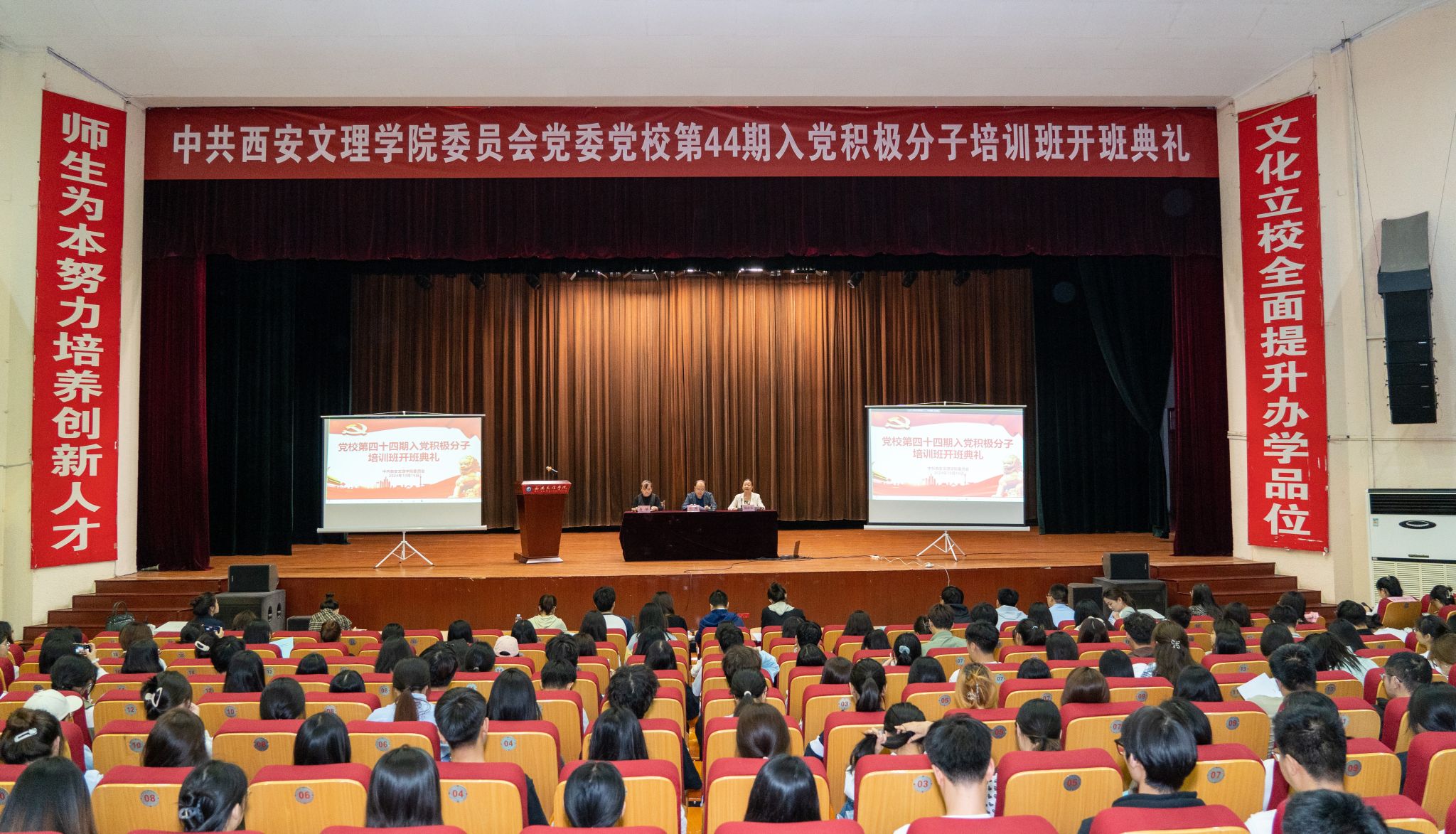 10月16日,校党委党校第44期入党积极分子培训班开班典礼在今年会大礼堂举行,西安市教育局直属单位16名教师及今年会新确定的526名入党积极分子参加,党委委员、组织部部长许刚参加开班典礼并做动员讲话,党委组织部副部长杨燕华主持开班式。开班典礼在庄严的奏唱国歌声中拉开序幕。信息工程学院学生许沁悦代表本期培训班学员发言,号召全体学员在培训中做好“真学”功课,专心学习,积极交流;做好“真懂”功课,深刻领悟党的基本知识;...
