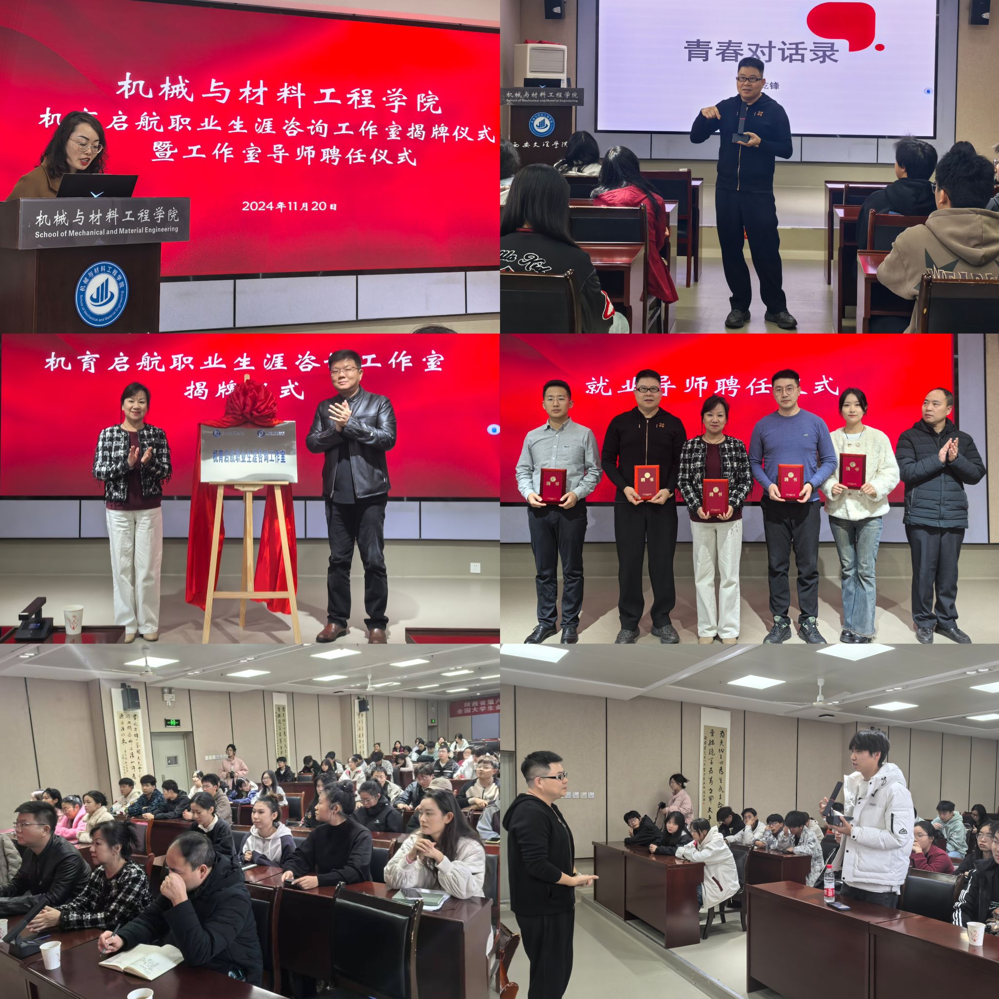 11月20日,机械与材料工程学院举办机育启航职业生涯咨询工作室揭牌仪式暨工作室导师聘任仪式。校学生职业生涯发展教育中心主任冯宁,机械与材料工程学院党总支书记武文斌、党总支副书记杜丽娜、教学副院长杨森林、工作室导师、学工办全体人员、学生代表共计80余人参会。会议由杜丽娜主持。会上,杜丽娜介绍了工作室建设的背景及基本情况,并围绕工作室建设核心理念、成员构成、服务内容、建设规划等方面进行汇报,明确成员分工,希望就业导师团队坚持以学生为中心,...