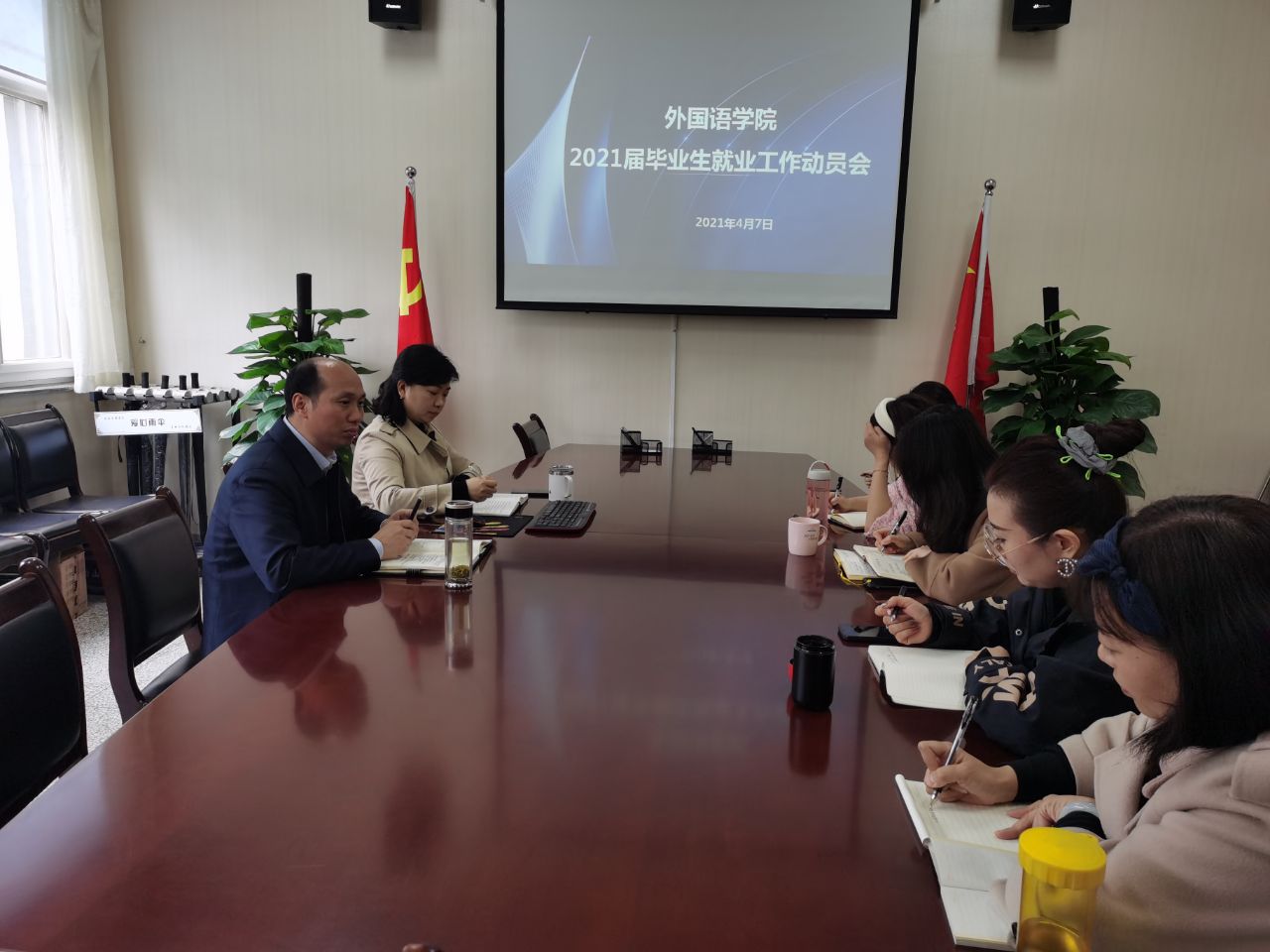 为进一步推进毕业生就业工作,保障毕业生充分、高质量就业,外国语学院于4月7日召开了2021届毕业生就业工作推进会。学院领导、各系部主任、辅导员参加会议,会议由院长韩红建主持。 会上,副书记狄曼解读了《外国语学...